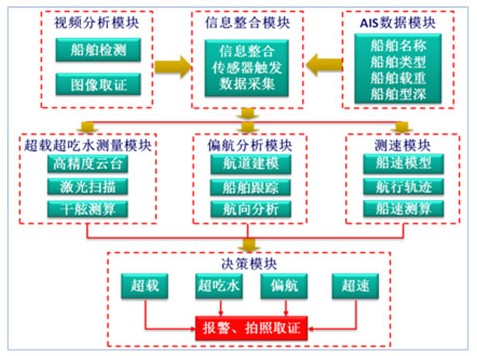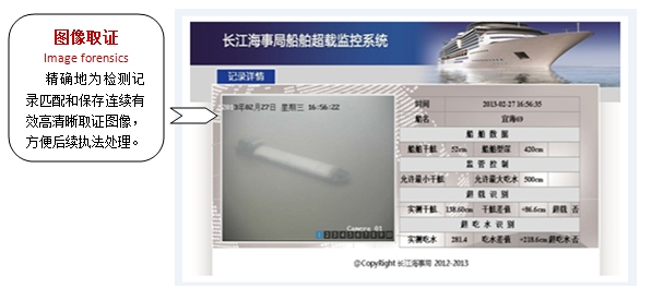 新一代智能“内河船舶超载超吃水检测系统”——利用GPS、电子航道图等现代通讯和IT技术,通过图像识别实时监测指定航道,及时发现目标船舶,驱动激光传感器采集原型数据,应用分析算法输出准确干舷值,精确判断是否超载、超吃水航行,发送报警消息到指定终端(AIS\电子显示屏)的全自动无人值守检测系统。